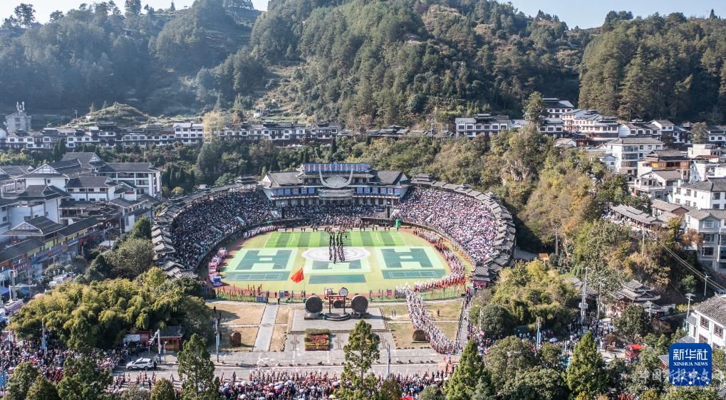 巡游隊(duì)伍陸續(xù)走進(jìn)雷山縣文體中心(11月10日攝,無(wú)人機(jī)照片)。