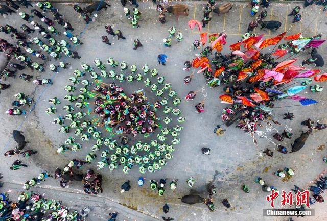 12月24日是貴州省從江縣加鳩鎮(zhèn)加牙苗寨十三年一度的鼓藏節(jié)第二天,苗族同胞開(kāi)展吹蘆笙、跳蘆笙舞、拉牛旋塘等活動(dòng),祭祀祖先,祈求平安。鼓藏節(jié)是苗族隆重的傳統(tǒng)祭祖儀式,2006年苗族鼓藏節(jié)被列入首批國(guó)家級(jí)非物質(zhì)文化遺產(chǎn)名錄。圖為苗族同胞在吹蘆笙、跳蘆笙舞、拉牛璇塘(無(wú)人機(jī)照片)。吳德軍 攝