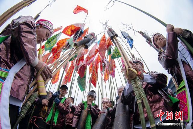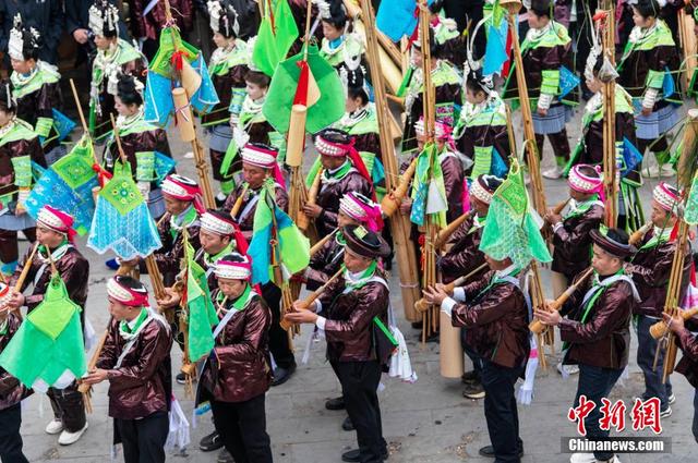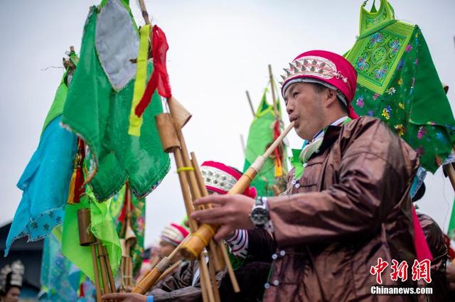 圖為苗族同胞在吹奏蘆笙。吳德軍 攝