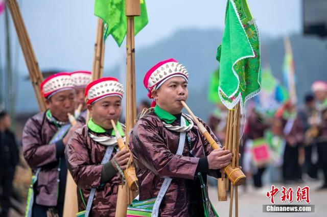 圖為苗族同胞在吹蘆笙、跳蘆笙舞、拉牛旋塘。吳德軍 攝