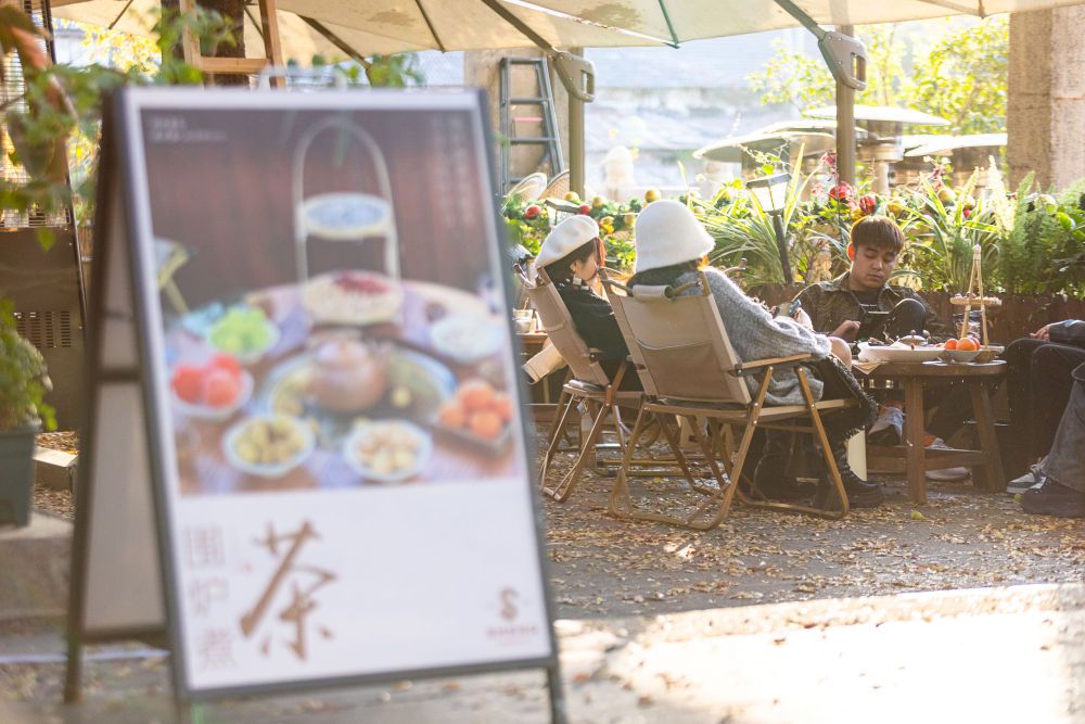 2023年11月25日,在浙江省湖州市吳興區(qū)龍泉街道田盛街,游客在一家飲品店圍爐煮茶。 新華社發(fā)(伊凡 攝)