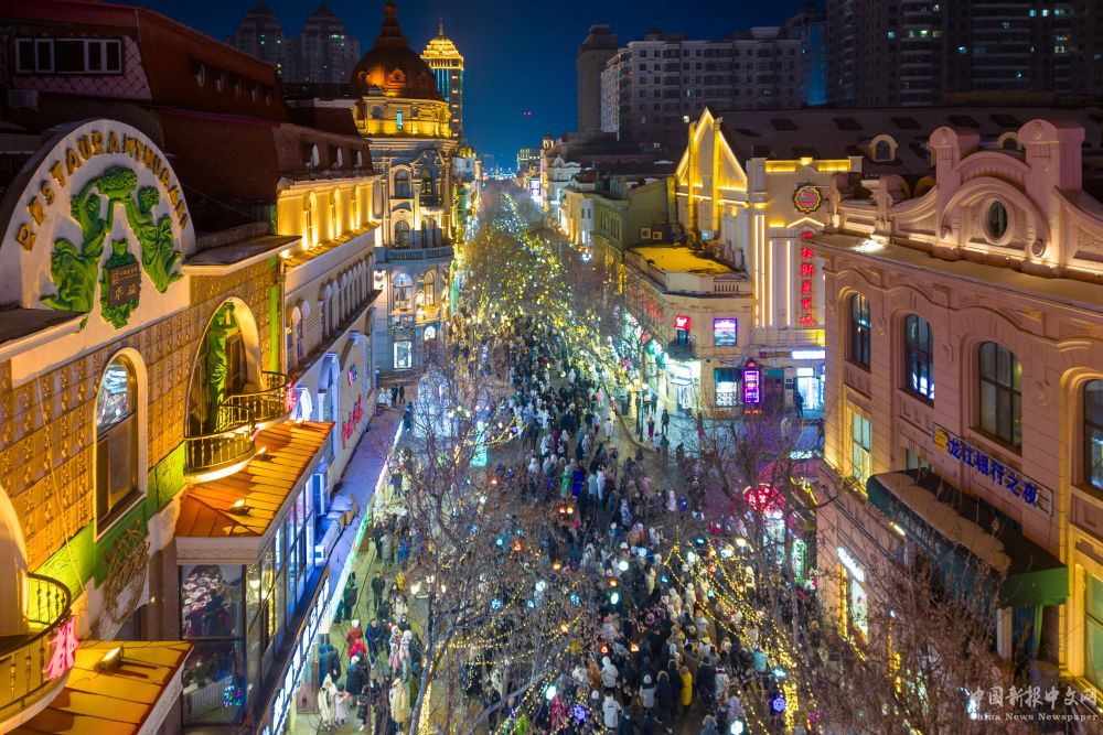 2024年1月9日,游客在哈爾濱百年老街中央大街上游玩(無人機(jī)照片)。 新華社記者 張濤 攝