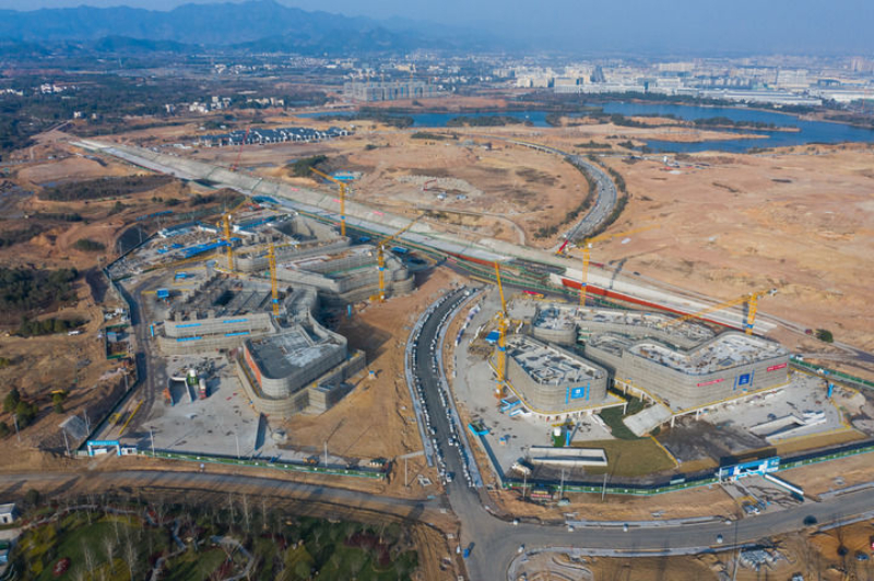 空中俯瞰浙江金漪湖科技創(chuàng)新策源地重大基礎(chǔ)設(shè)施項目施工現(xiàn)場(2024年1月3日攝,無人機(jī)照片)。新華社記者 徐昱 攝
