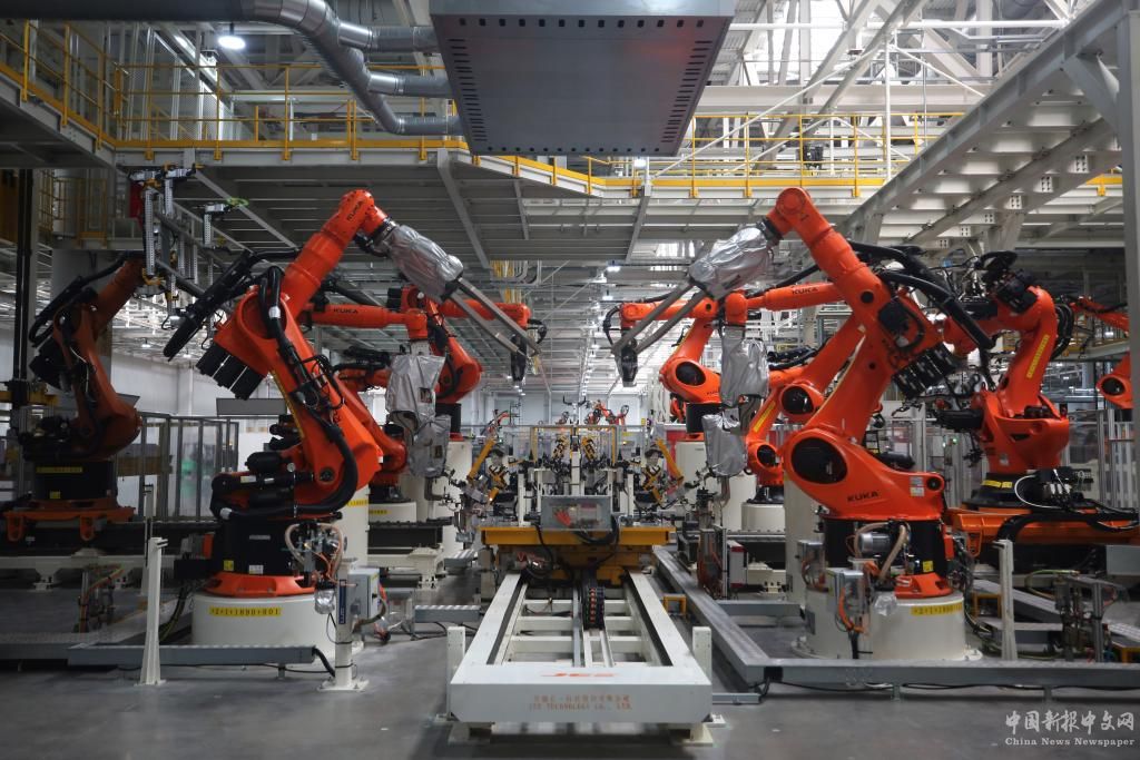 大眾安徽模塊化電驅(qū)動(dòng)平臺(tái)工廠車身車間一角。(2023年5月29日攝)新華社記者 杜瀟逸 攝
