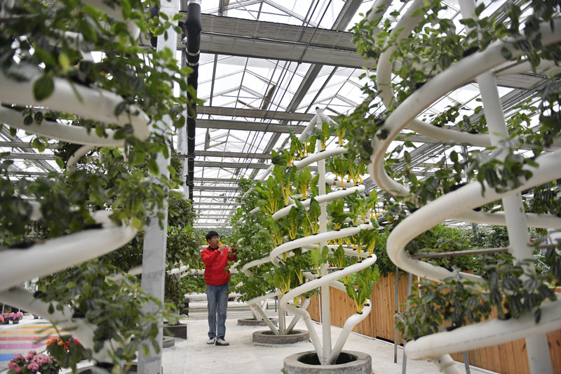 在河北省曲周縣育苗產(chǎn)業(yè)園,苗樂園科技小院的學(xué)生在查看無土栽培蔬菜。新華社記者 岳文婷 攝