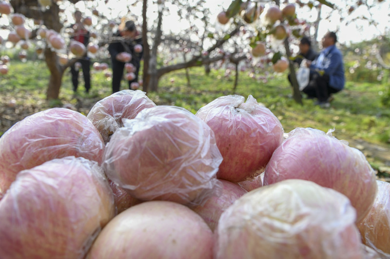 濟源市邵原鎮(zhèn)史家腰村農(nóng)民在果園釆摘富硒蘋果。新華社發(fā)(苗秋鬧攝)