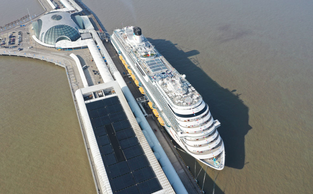 2024年1月1日,“愛(ài)達(dá)·魔都號(hào)”在上海吳淞口國(guó)際郵輪港正式開(kāi)啟商業(yè)首航。這是郵輪停靠在上海吳淞口國(guó)際郵輪港(無(wú)人機(jī)照片)。新華社記者丁汀 攝