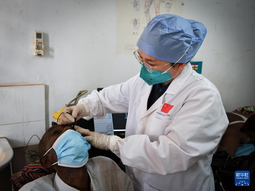 2月5日,在中非共和國首都班吉,援中非中國醫(yī)療隊眼科醫(yī)生陳金桃在班吉友誼醫(yī)院為患者做眼部檢查。新華社記者 韓旭 攝