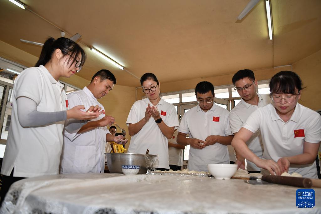 2月4日,在中非共和國首都班吉,援中非中國醫(yī)療隊隊員在位于班吉友誼醫(yī)院的駐地內(nèi)一起包餃子。新華社記者 韓旭 攝
