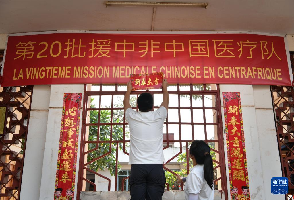 2月4日,在中非共和國首都班吉,援中非中國醫(yī)療隊隊員在位于班吉友誼醫(yī)院的駐地內(nèi)貼對聯(lián)。新華社記者 韓旭 攝