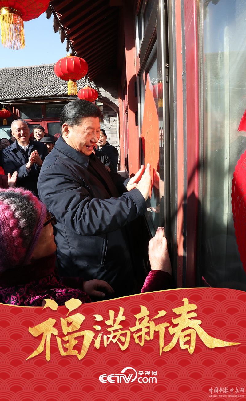 2019年2月1日,在北京前門東區(qū)草廠四條胡同32號小院,居民們熱情邀請前來拜年的總書記一起貼“福”字。總書記興致勃勃地拿起一幅紅底金色大“福”字,嫻熟地貼在大門上。他對居民們說:希望咱們街坊鄰居們永遠幸福。