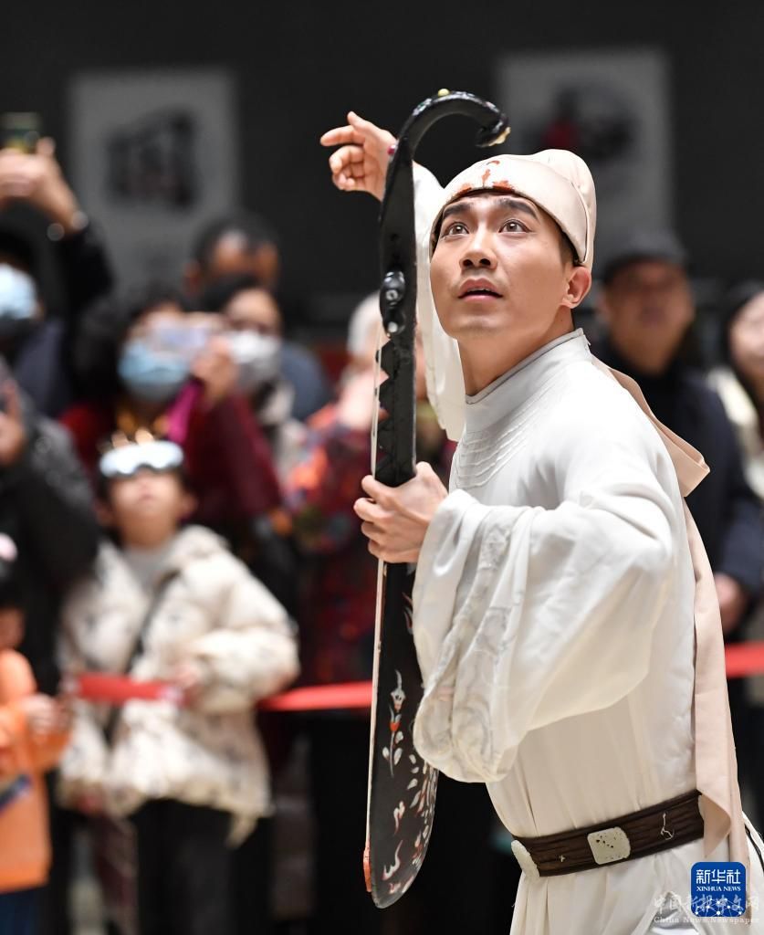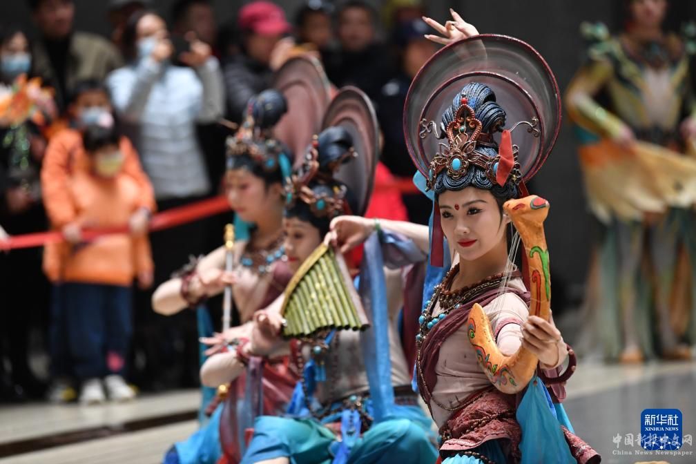 2月11日,演員在位于蘭州的甘肅簡牘博物館里為市民和游客表演《樂動敦煌》。