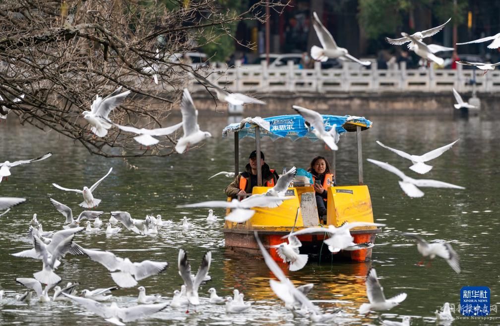 2月11日,人們在云南昆明翠湖公園內(nèi)劃船、賞鷗。