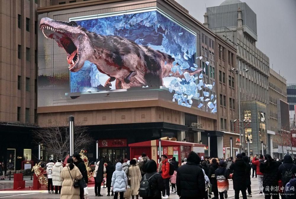北京,王府井商業(yè)街。以百貨大樓及懋隆兩處裸眼3D屏幕為核心,多屏數(shù)字聯(lián)動串起王府井六個公共大屏,琉璃金龍在金街大屏穿梭,吸引游客駐足觀賞。消費場景、品牌上新,王府井商業(yè)街人氣旺盛。