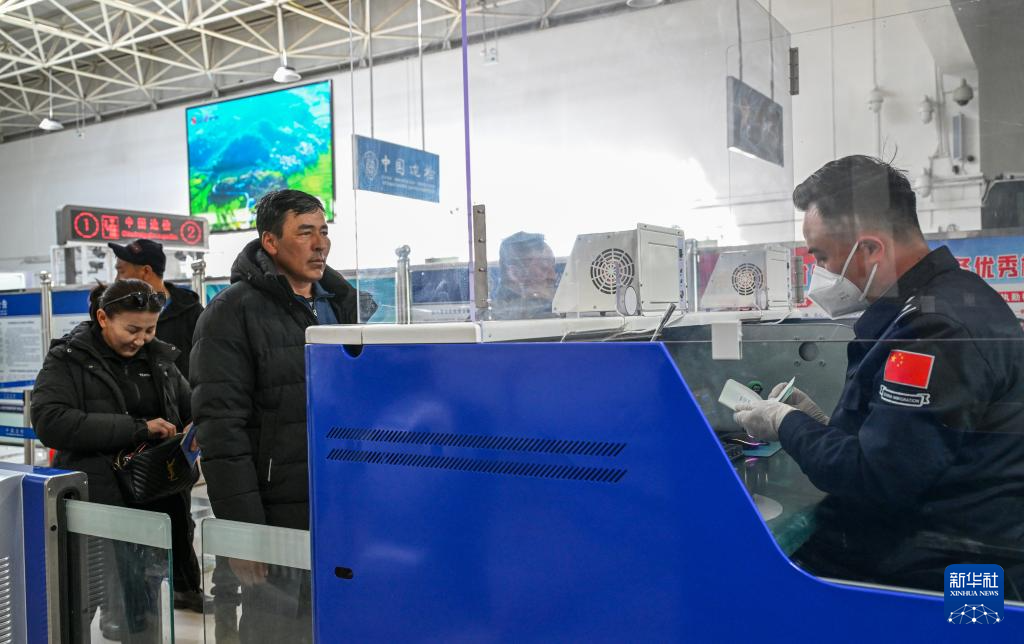 3月13日,在新疆塔克什肯口岸,民警在出境大廳核驗(yàn)旅客證件。