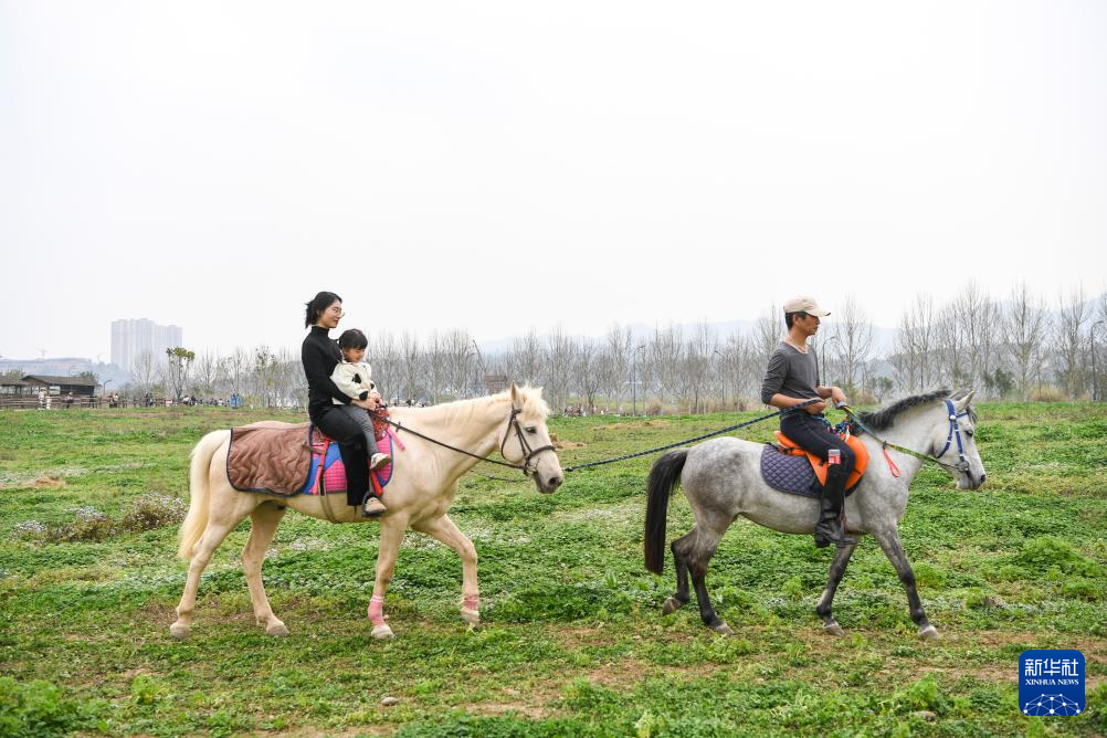 3月16日,游客在重慶廣陽島勝利草場體驗(yàn)騎馬。新華社記者 王全超 攝