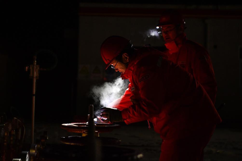 2023年12月22日晚,在陜西省延安市安塞區(qū),中國石油長慶油田分公司第一采氣廠作業(yè)七區(qū)工作人員在巡檢天然氣輸氣設(shè)備。新華社記者 張博文攝