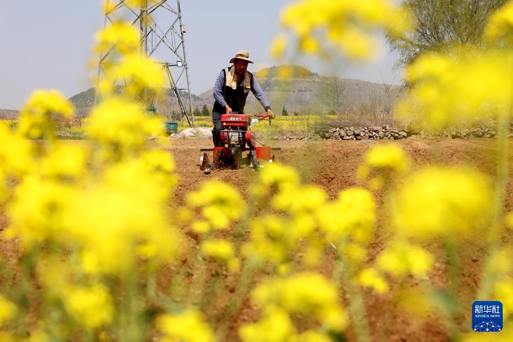 3月31日,山東省棗莊市齊村鎮(zhèn)喬屯村農(nóng)民在油菜花田間耕作。