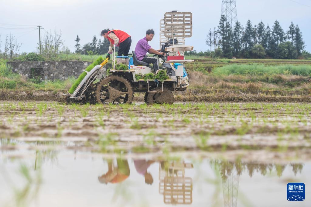3月31日,在湖南省永州市道縣蚣壩鎮(zhèn)合興村,和豐農(nóng)機(jī)專業(yè)合作社員工駕駛機(jī)械開展早稻插秧作業(yè)。