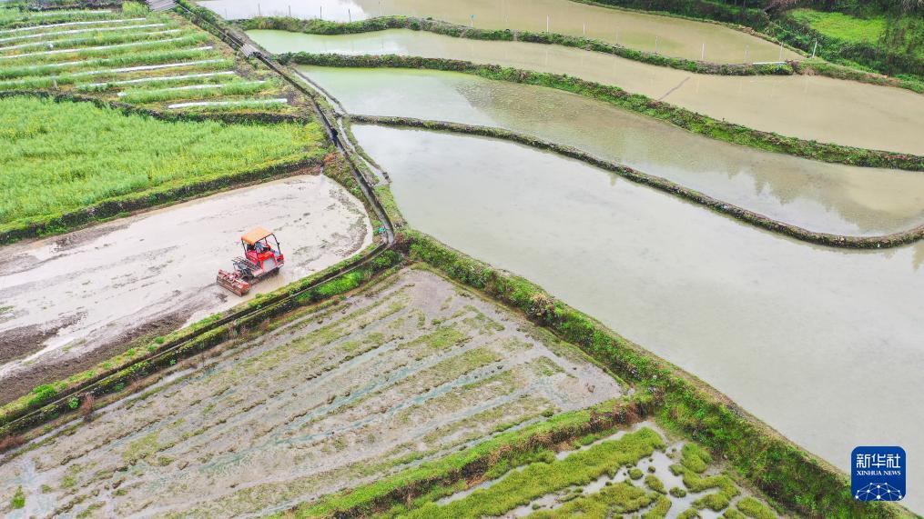 3月31日,湖南省永州市雙牌縣麻江鎮(zhèn)麻江村村民駕駛農(nóng)機(jī)在翻耕農(nóng)田(無人機(jī)照片)。