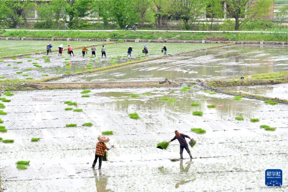 3月31日,在湖南省婁底市雙峰縣井字鎮(zhèn)花橋村,農(nóng)民在田間拋秧。