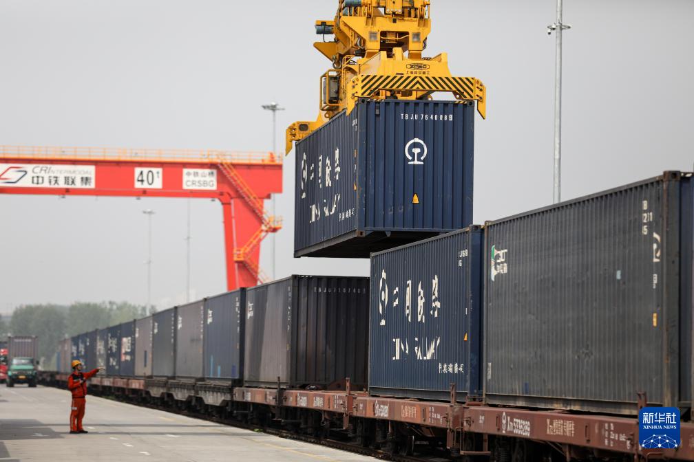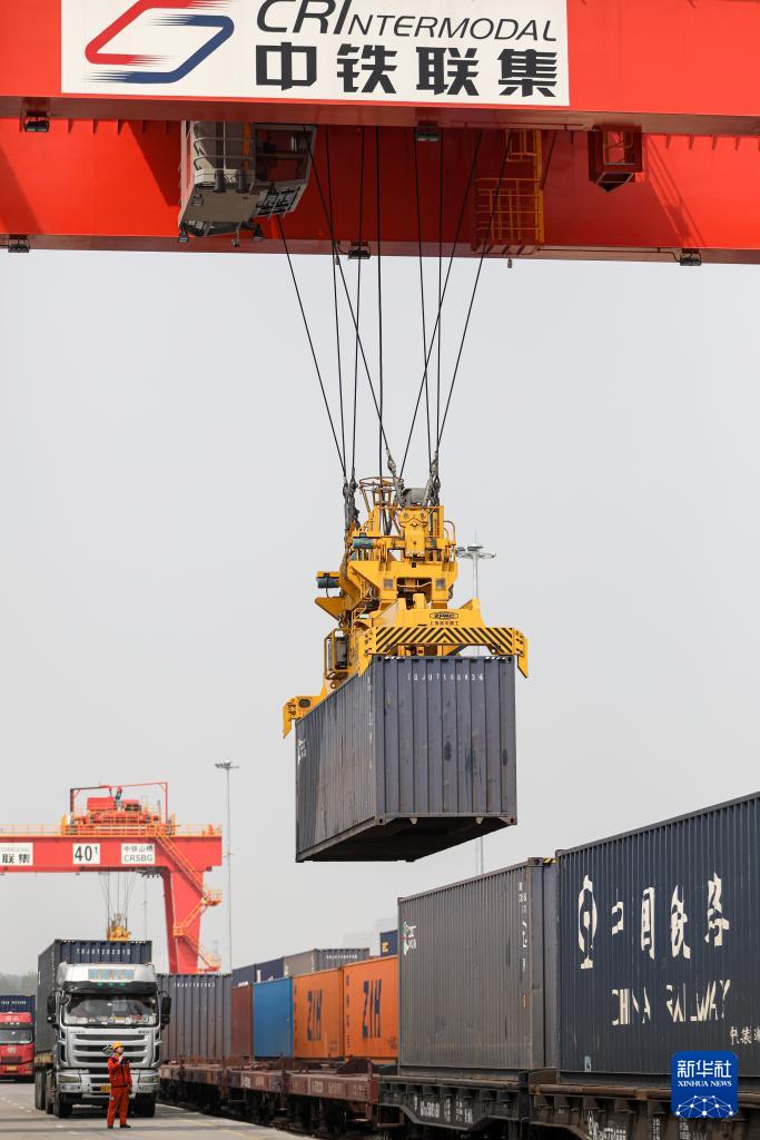 4月11日,在國鐵集團(tuán)鄭州局圃田站,中鐵聯(lián)集的龍門吊向貨運(yùn)列車上裝載集裝箱。