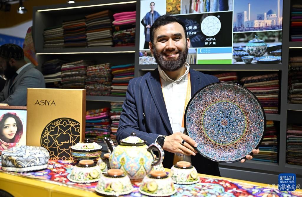 4月13日,一名烏茲別克斯坦展商在展示手工陶瓷盤。