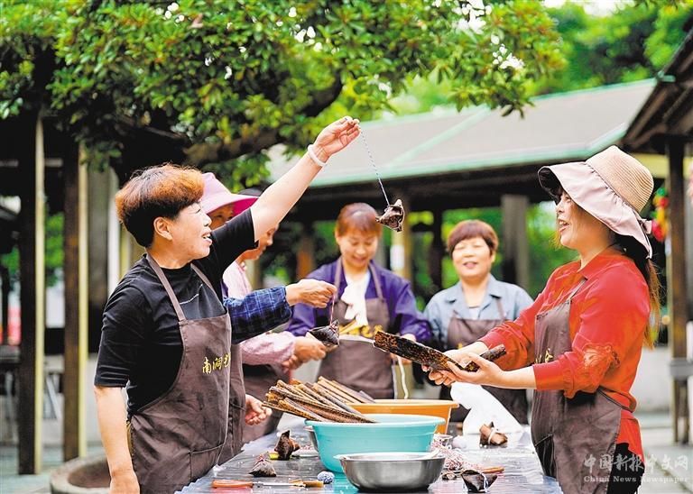 5月23日,定海區(qū)新建村村民在包粽子迎端午。該村定期開展“我們的節(jié)日”“我們的村晚”等活動,突出“農(nóng)耕”“漁趣”“民俗”等主題,讓村民在家門口樂享幸福生活。
