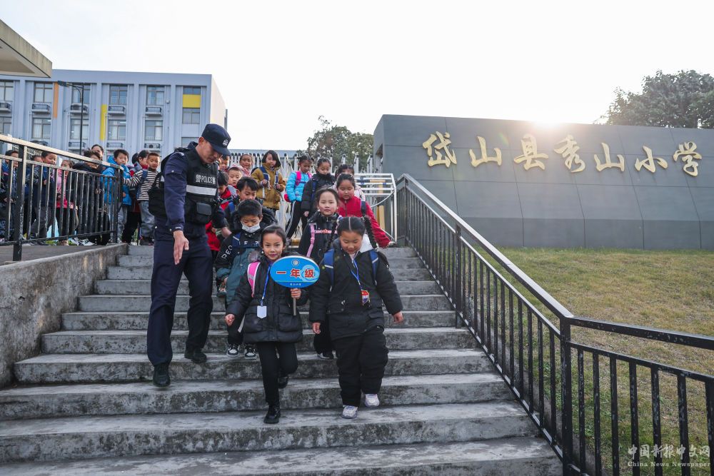 2023年12月20日,秀山派出所民警在秀山小學(xué)放學(xué)時(shí)間參與“護(hù)學(xué)崗”維持秩序,同時(shí)接獨(dú)自放學(xué)的學(xué)生去“民生小鋪”。浙江省舟山市岱山縣公安局秀山派出所聯(lián)合鄉(xiāng)鎮(zhèn)、社區(qū)成立“民生小鋪”,為當(dāng)?shù)鼐用瘛⑼鈦?lái)務(wù)工人員及其子女等服務(wù),協(xié)助解決外來(lái)務(wù)工人員在工作、生活等方面的矛盾和問(wèn)題,助力鄉(xiāng)鎮(zhèn)基層治理。新華社記者 徐昱 攝