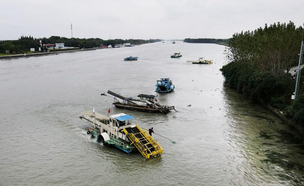 蘇浙滬三地的保潔船在蘇浙滬交界水域太浦河流域聯合清理水面浮游植物(2020年10月15日攝,無人機照片)。新華社記者 方喆 攝