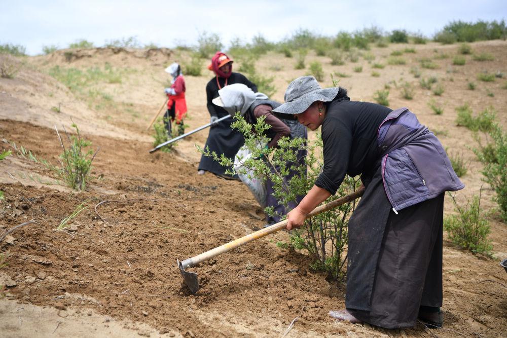 牧民在甘肅省甘南藏族自治州瑪曲縣歐拉鎮(zhèn)黃河沿岸一處沙化草原治理點補種草籽(2023年7月6日攝)。新華社記者 方欣 攝