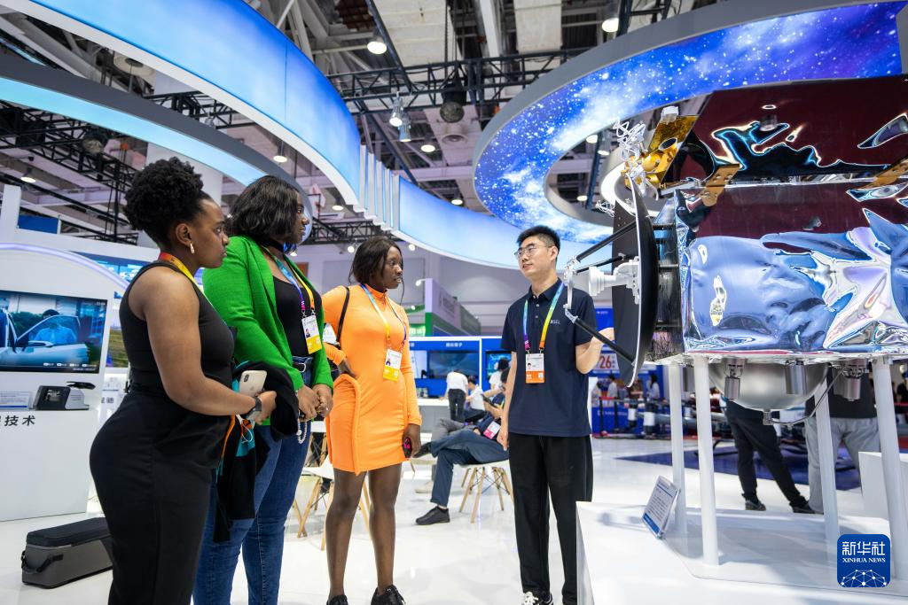 5月31日,參展商(右一)在第十三屆中國中部投資貿(mào)易博覽會上向觀眾介紹“天都一號”通導(dǎo)技術(shù)試驗(yàn)衛(wèi)星。