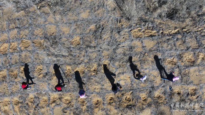 治沙工人在位于毛烏素沙地邊緣的寧夏靈武白芨灘國(guó)家級(jí)自然保護(hù)區(qū)栽植檸條(2024年3月19日攝,無人機(jī)照片)。新華社記者 王鵬 攝