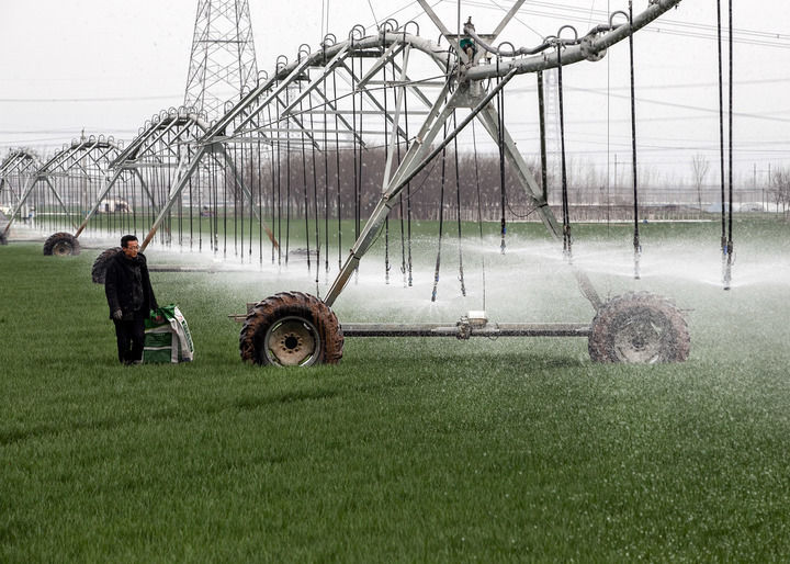 2024年3月18日,在河南省焦作市博愛縣孝敬鎮(zhèn)東原莊村瑞輝家庭農(nóng)場(chǎng),村民使用全自動(dòng)指針式噴灌機(jī)進(jìn)行澆灌作業(yè)。新華社發(fā)(程全攝)