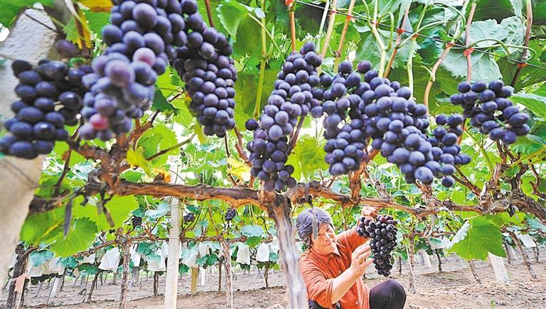 7月11日,農(nóng)戶在朱村葡萄科技示范園采摘葡萄。朱村整合村莊周邊河道、荒灘、荒地,規(guī)劃建設(shè)朱村現(xiàn)代農(nóng)業(yè)示范園,打造“好日子”系列農(nóng)產(chǎn)品品牌,年可實(shí)現(xiàn)產(chǎn)值3200萬(wàn)元。