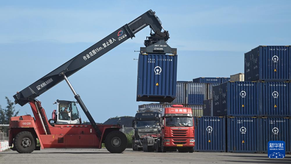 在欽州鐵路集裝箱中心站貨場(chǎng),一輛正面吊車在給貨車裝運(yùn)集裝箱(8月1日攝)。