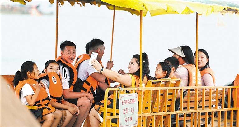 7月23日,游客在查干湖北景區(qū)沙灘游樂園乘船游覽。優(yōu)美的生態(tài)環(huán)境、多樣的特色活動吸引越來越多的游客前來查干湖旅游。