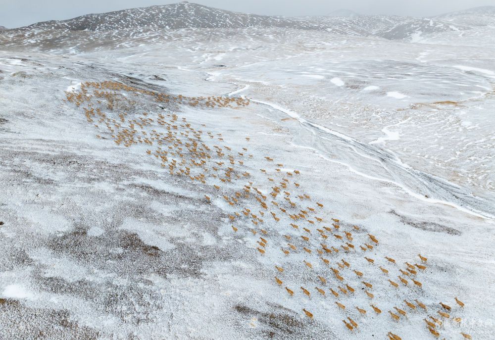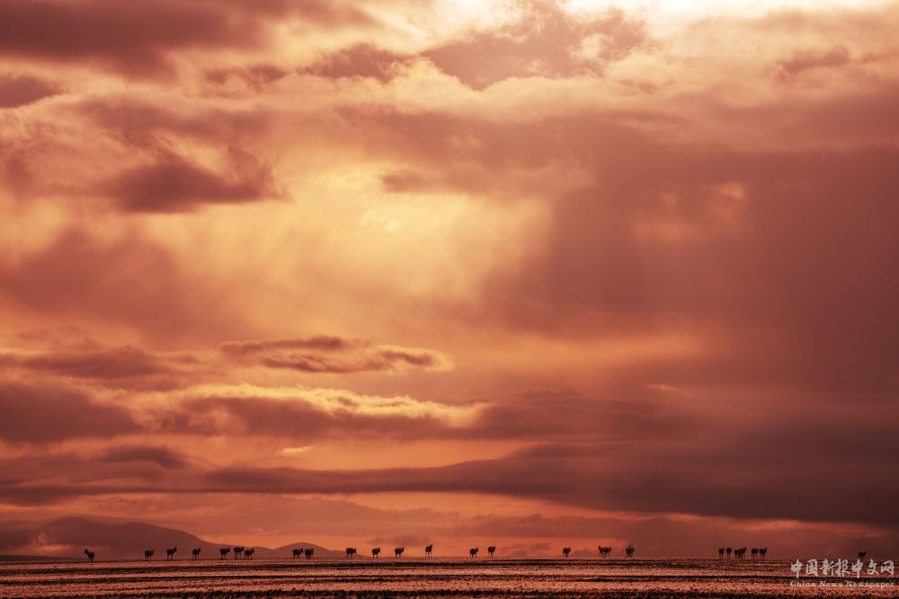 2024年6月15日清晨雪后,在西藏羌塘國家級自然保護(hù)區(qū),一群藏羚羊迎著朝霞前行在遷徙路上。