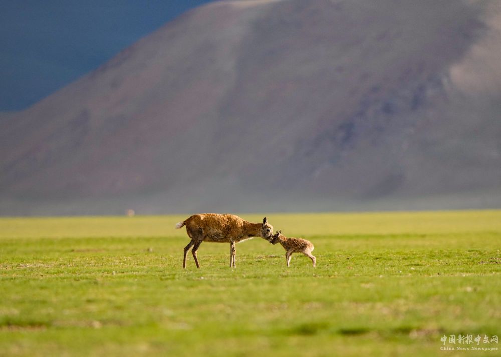 這是2024年6月16日在西藏那曲市申扎縣買巴鄉(xiāng)魯確塘草原上拍攝的藏羚羊母子。