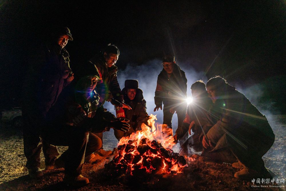 2024年5月10日,野生動物專業(yè)管護(hù)隊(duì)員在西藏羌塘國家級自然保護(hù)區(qū)的宿營地用野牦牛糞烤火取暖。