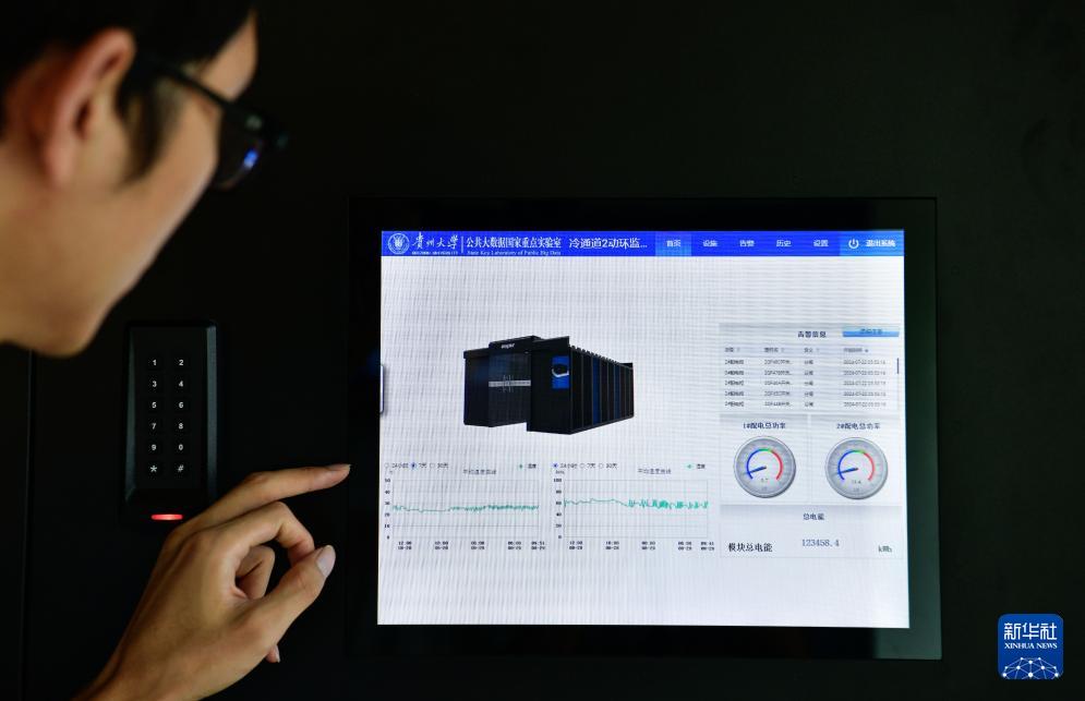 8月29日,工作人員在貴州大學(xué)省部共建公共大數(shù)據(jù)國家重點實驗室算力中心檢查微模塊動態(tài)環(huán)境監(jiān)測系統(tǒng)運行情況。
