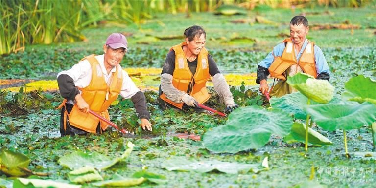 8月29日,肥東縣長(zhǎng)臨河鎮(zhèn)十八聯(lián)圩生態(tài)濕地,管護(hù)人員在清理水生植物。