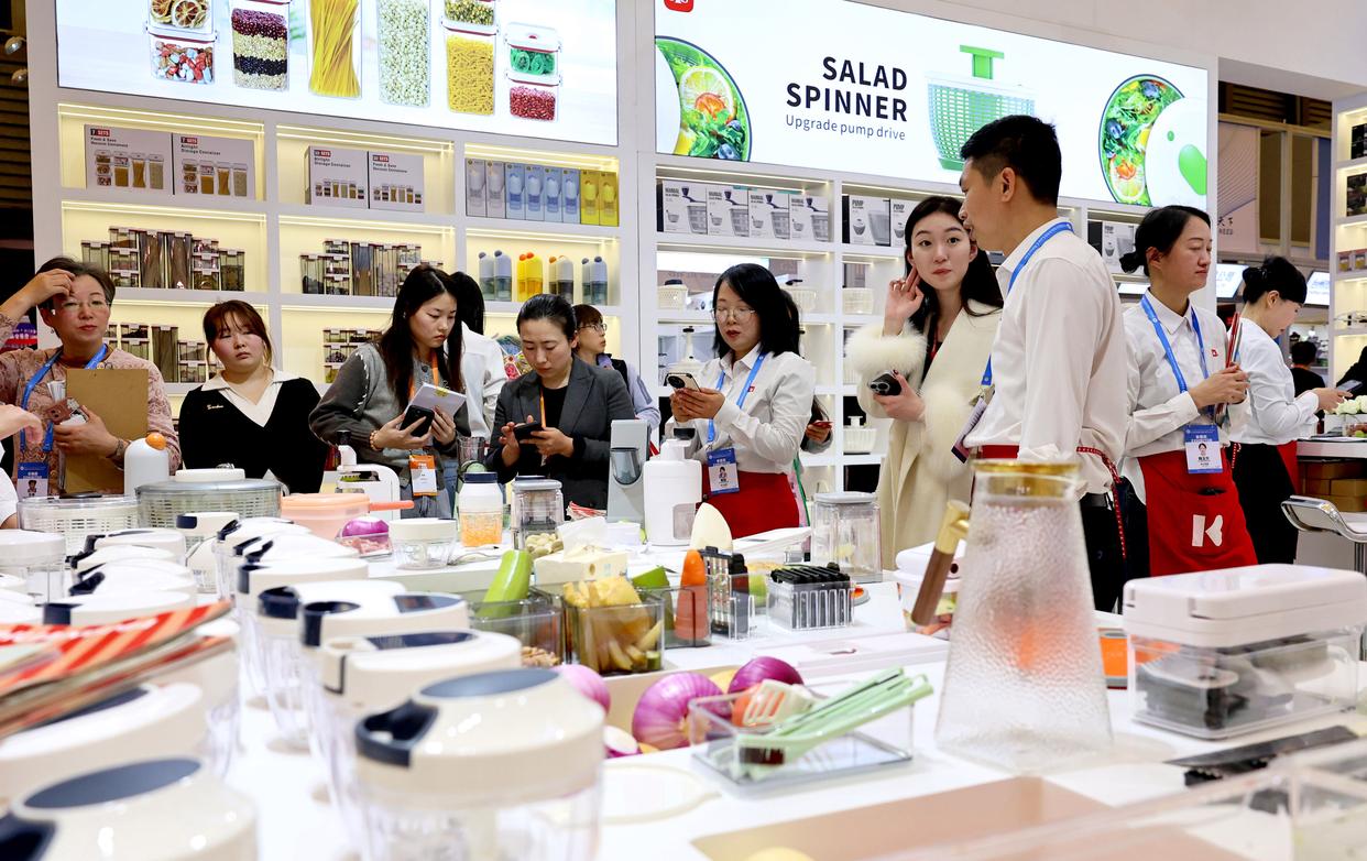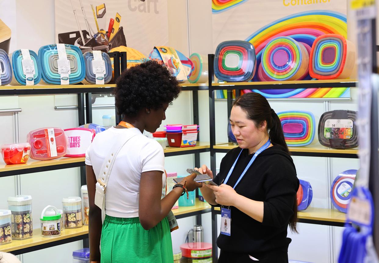 3月1日,人們在第33屆華交會一處家庭用品展位交流。新華社記者 方喆 攝
