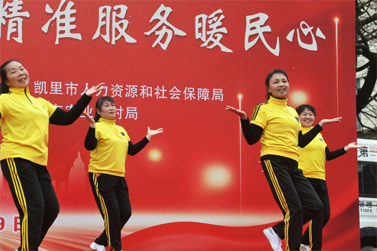 貴州省凱里市洗馬河街道文化社區(qū),一文藝隊(duì)在“春風(fēng)行動(dòng)”系列招聘會(huì)上表演舞蹈。(楊仁海 攝)