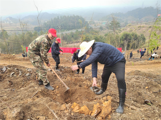 植樹現(xiàn)場,黨旗飄揚,熱火朝天。黨員干部們攜帶鋤頭、鐵鍬、水桶等植樹工具,在林業(yè)專業(yè)人員的現(xiàn)場指導(dǎo)下,有的忙碌挖坑,有的搬運樹苗,有的負責(zé)澆水……大家通力合作,默契配合,以實際行動為生態(tài)環(huán)境增添新綠,彰顯了廣大黨員干部在生態(tài)文明建設(shè)中的責(zé)任與擔(dān)當(dāng)。他們精心挑選了500多株北美楓香樹苗,將一株株樹苗穩(wěn)穩(wěn)地植入土中,短短時間內(nèi)就讓山場大地披上了一片片“綠色的希望”。