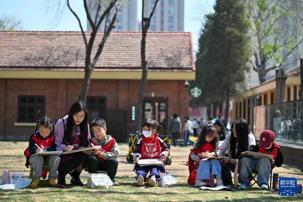 4月6日,在天津市河?xùn)|區(qū)泰達(dá)·津一產(chǎn)業(yè)公園,老師帶領(lǐng)學(xué)生寫(xiě)生。
