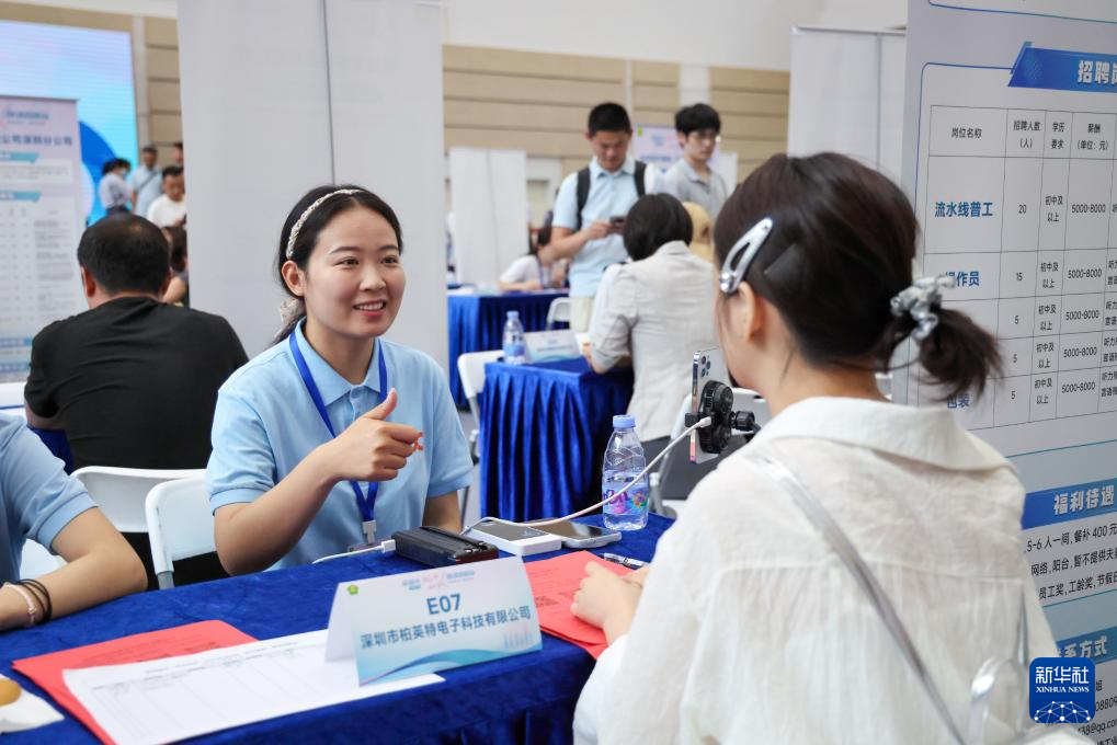 5月16日,在招聘會現(xiàn)場,求職者與企業(yè)招聘人員交流。