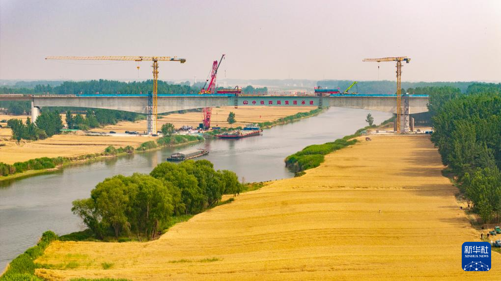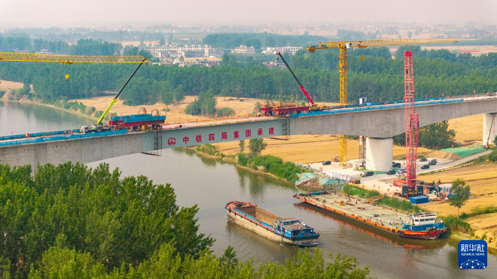 這是正在吊裝施工中的阜淮鐵路跨渦河特大橋(5月29日攝,無人機(jī)照片)。