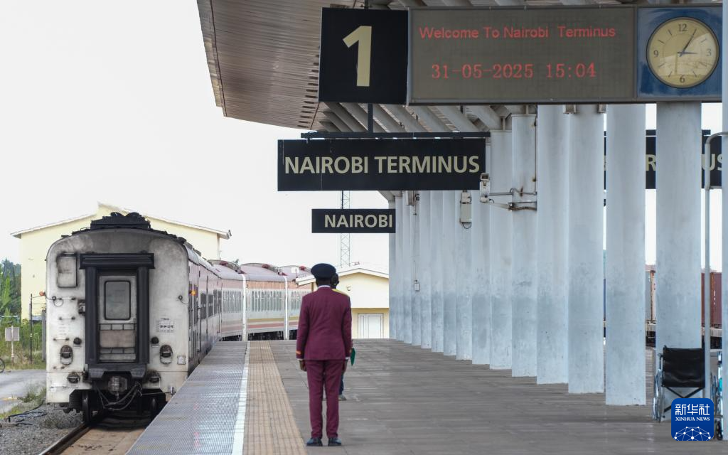 5月31日,在蒙內(nèi)鐵路內(nèi)羅畢站,工作人員目送開往蒙巴薩的E2次列車駛離站臺。