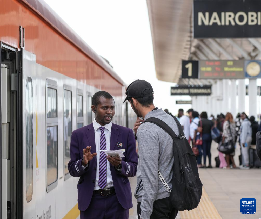 5月31日,在蒙內(nèi)鐵路內(nèi)羅畢站,乘務(wù)員為乘客檢票。